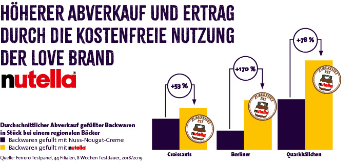 Für diese Nachfrage ist Zeelandia zum Start ins neue Jahr eine besonders leckere Kooperation mit nutella® eingegangen und hat eine Vielzahl an eigens entwickelten und sorgfältig ausgewählten Rezepten von Gebäcken mit nutella® für Sie zusammengestellt. Begeistern Sie Ihre Kunden mit Zeelandia-Gebäcken wie z. B. dem soften Berliner gefüllt mit nutella® oder der saftig-cremigen Käsetorte zubereitet mit nutella®. Loben Sie dabei gezielt die Marke nutella® aus, um Ihre Abverkäufe zu erhöhen und das besondere Genusserlebnis in Ihre Bäckerei zu bringen. Testergebnisse von Ferrero zeigen, dass Sie Ihren Abverkauf und Ihren Ertrag durch die Nutzung der Love Brand nutella® als Füllung für Backwaren steigern können.