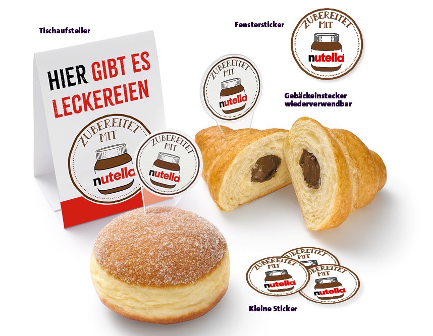Für eine aufmerksamkeitsstarke Platzierung der Marke sendet Ihnen Ferrero auf Anfrage gratis geeignete nutella®-Werbematerialien zu. Um Ihre Gebäcke gekonnt in Szene zu setzen, stehen beispielsweise Tischaufsteller, Fenstersticker, wiederverwendbare Gebäckeinstecker und kleine Sticker zur Auswahl. Weitere Werbematerialien sind auf Anfrage verfügbar.